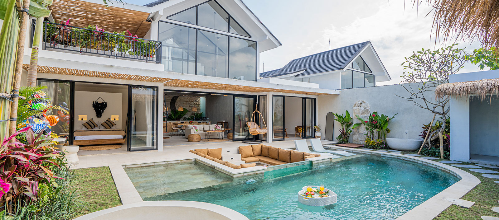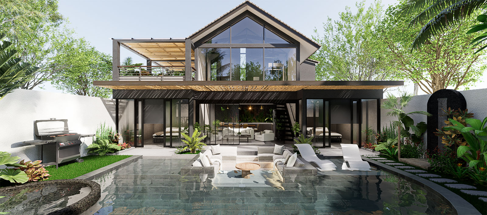 The design is open and effortless: sliding glass doors, double-height ceilings, a generous pool, and sunken lounge that invites lazy afternoons and lively evenings. It’s the kind of space that feels good to walk into and hard to walk away from.